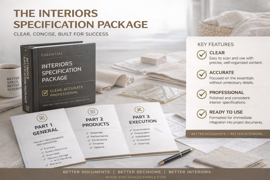 SpecsMadeSimple’s Interiors Package gives you 120 fully editable specification sections in Microsoft Word. Buy once. Use on every project. No subscription required.