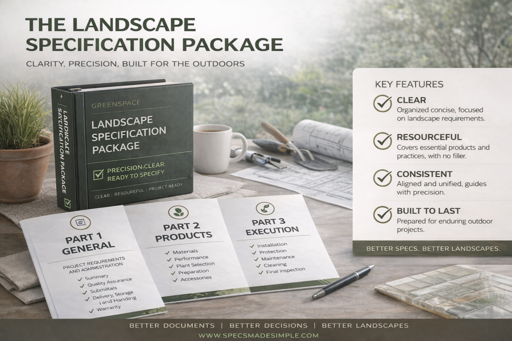 Appropriately scaled for site work. Landscape and site specification sections on most projects don’t require 20 pages of administrative overhead. SpecsMadeSimple landscape sections run one to four pages — covering what matters for exterior improvement work without the complexity of sections written for large-scale civil infrastructure.